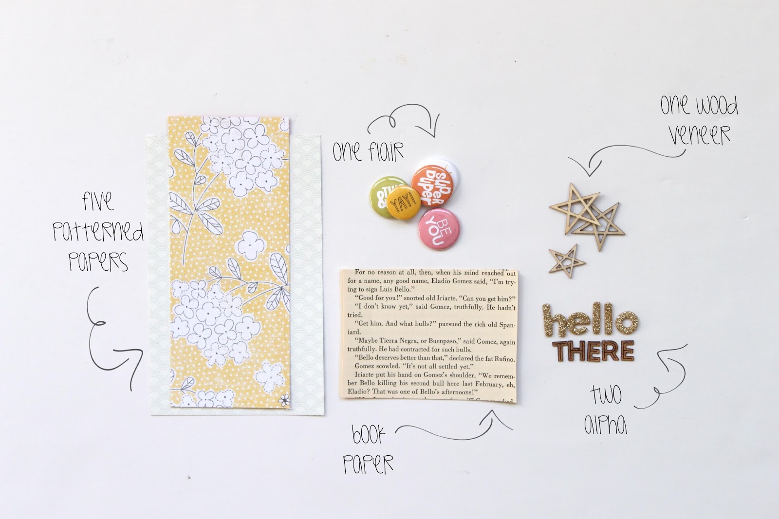 Here is my take on this challenge.... I was really feeling circles today, so I went with it. Circles are so fun and easy to play with and can be quite eye catching. I used a small and large circle punch for my patterned papers and photos and then just played around with layering them. I added in the book paper too for a little bit of contrast. I had a harder time with the alpha since I wanted my title to fit inside of one of the circles. In the end, I used the Studio Calico Cork Alpha stickers and some smaller Basic Grey for my title.